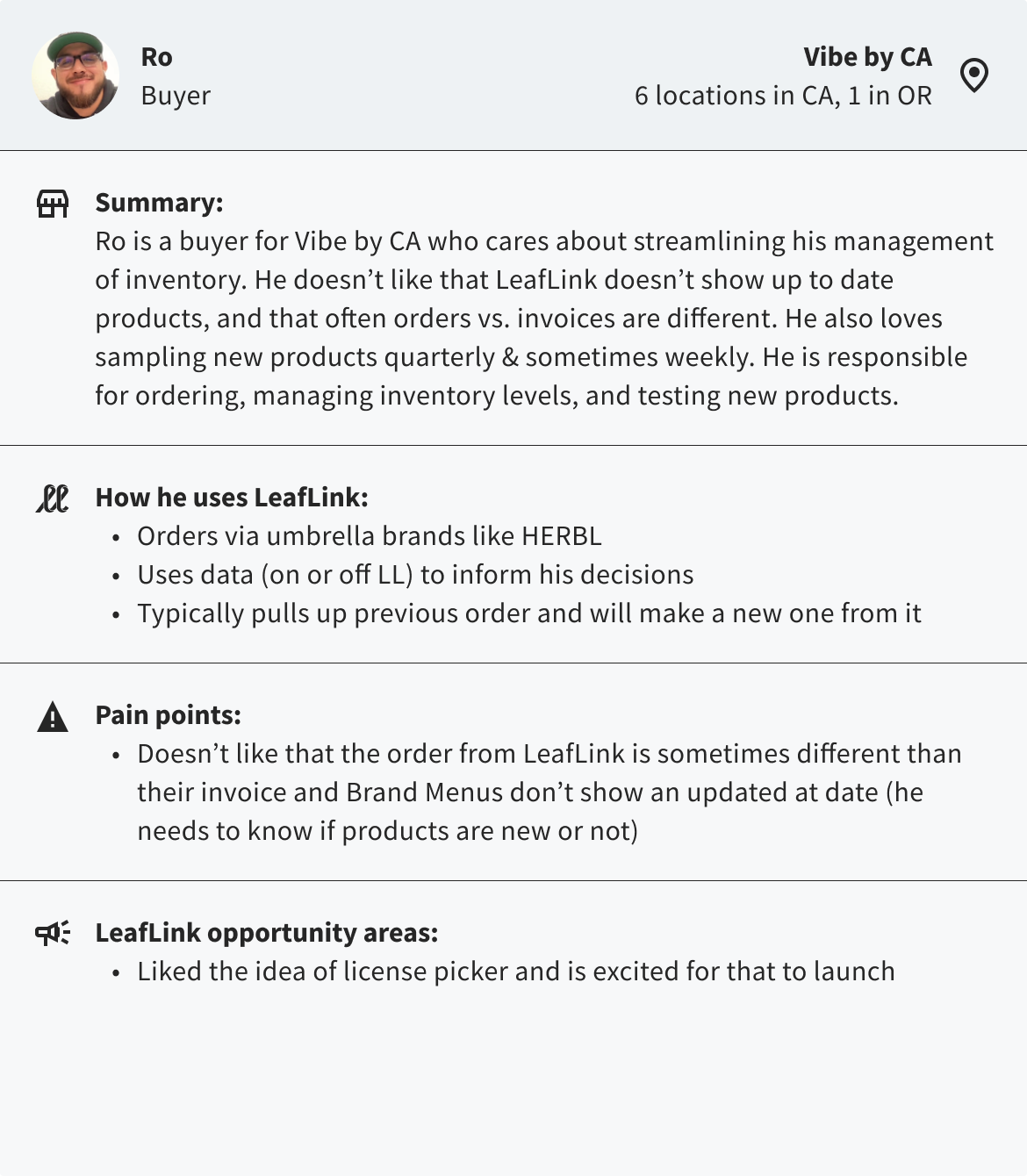 Next steps: Different stores have different demographics so recommendations should be tailored to this. Ability to add non-LeafLink sellers’ contact info which would then trigger an email to that brand rep asking if they’d be interested in LeafLink. Adding rating systems for product level (photos don’t do justice, they want to know the quality of the product, especially flower)