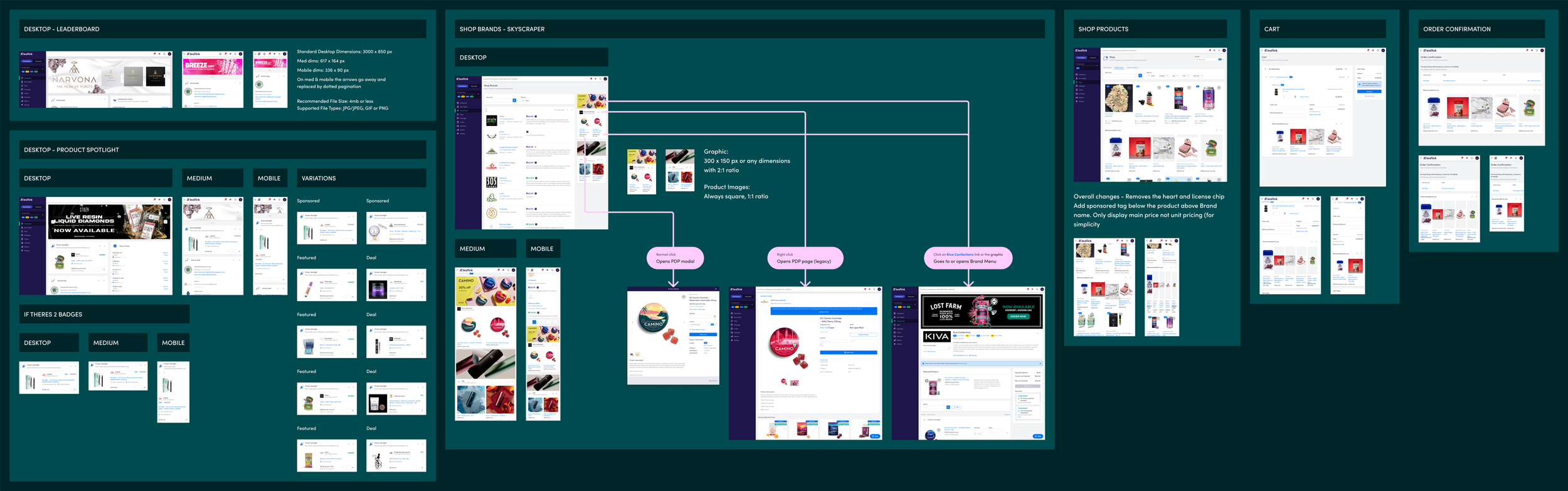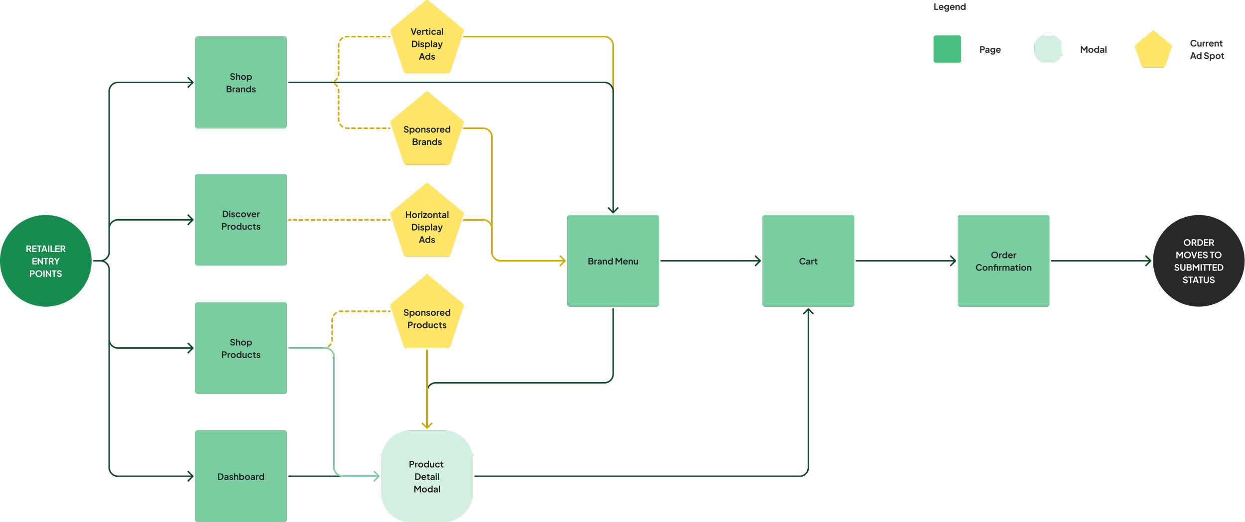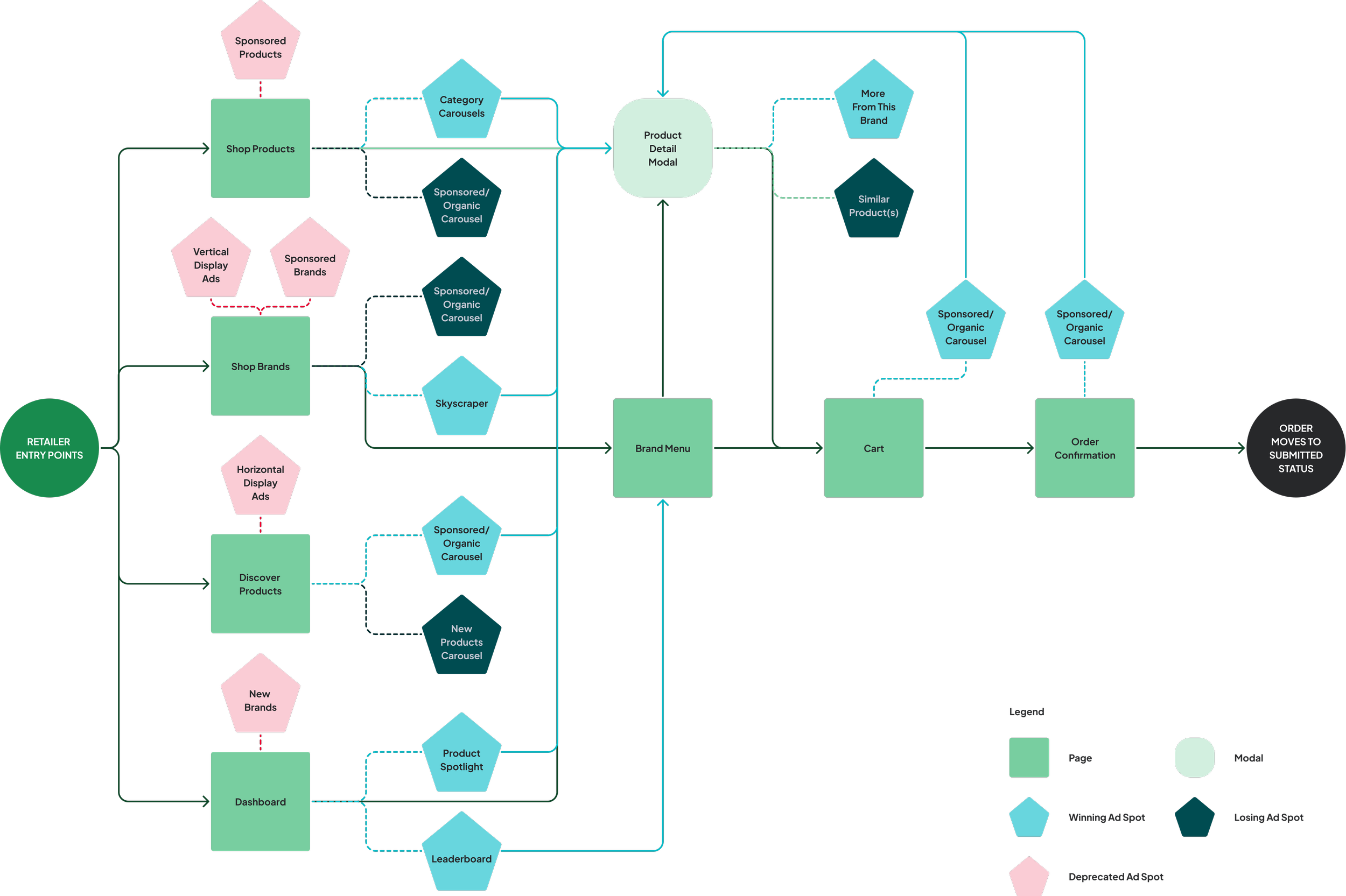 Retailers can now engage with ads through various entry points, such as the Dashboard, Shop Products, Shop Brands, or Discover Products. During our testing, we tried several formats and ultimately decided to remove the less effective touch points marked in red. The most successful options we identified included Sponsored/Organic Carousels, which appear on all shop pages, the cart, and during checkout. Additionally, Skyscrapers on the Shop Brands page, as well as the Product Spotlight and Leaderboard on the dashboard, have proven to be effective.