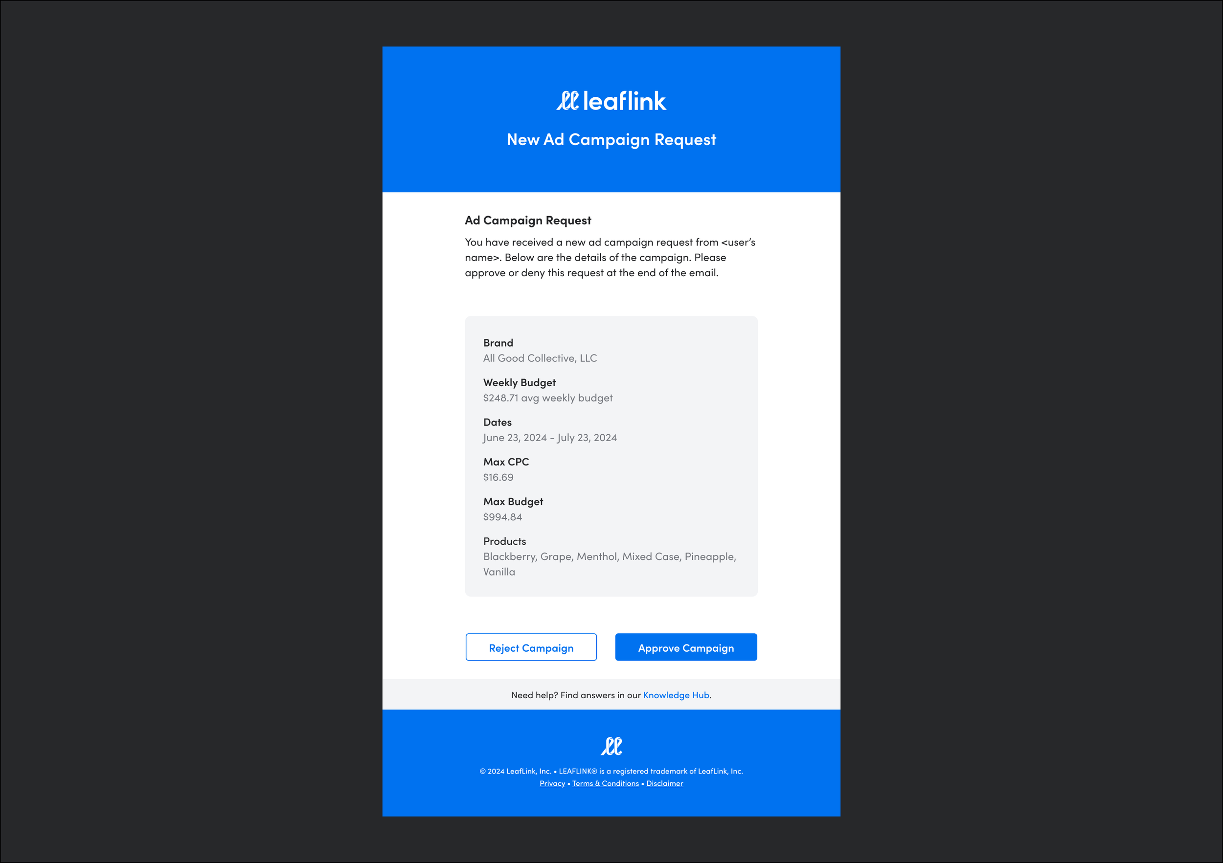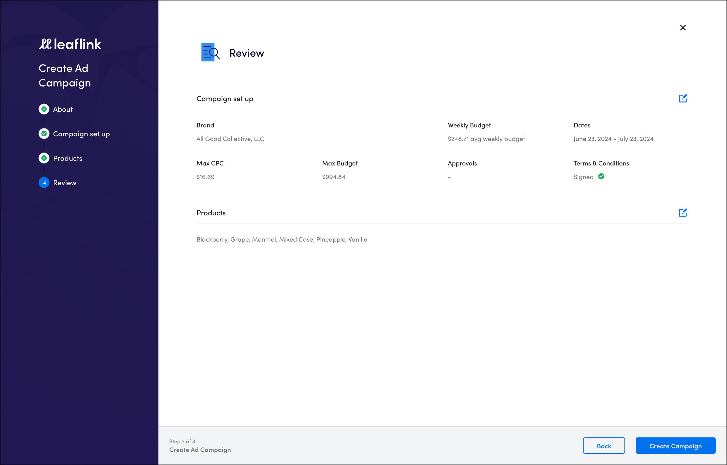 The onboarding process is now smooth and tailored to fit their needs. When users log into their account, they land on their Dashboard, or they can access it directly through a CTA in a marketing email. Inside LeafLink, they can navigate to the Inventory or Reports pages, both of which have a direct link to the new Advertising page. This new Advertising page empowers brands to create and manage their advertising campaigns independently, removing the need to consult with a LeafLink Ad Ops representative. Users can follow a simple set of steps to enter all the necessary campaign details, select the products they want to include, and complete their campaign setup. After launching, they’ll have the flexibility to edit or cancel their campaign, initiate new ones, and view analytics to fine-tune their strategy as needed.