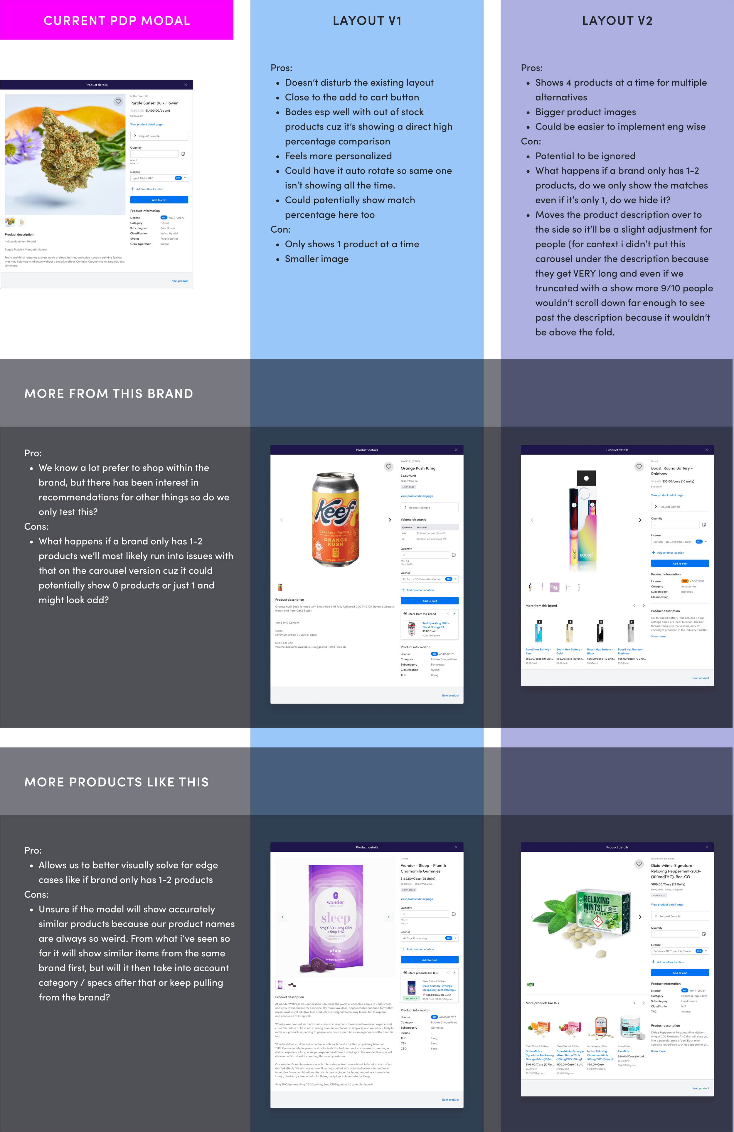 With these new insights, I laid out several test strategies to determine which types of recommendations and ad formats would perform the best. These included testing different combinations of product types, such as Trending Products vs. Frequently Bought Together, and variations of related product carousels. Additionally, we worked with the data team to track user interactions with these different ad placements and understand how they impacted retailer engagement and sales.